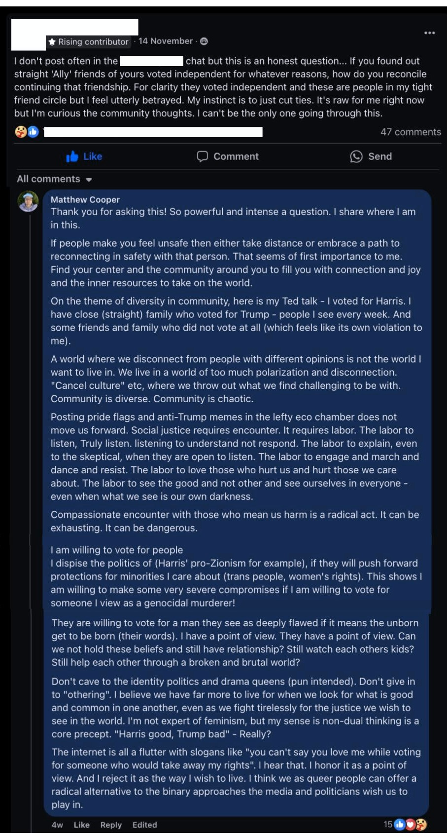 where has retributive justice gotten us? does it give you the relief you are seeking? the thought that people who believe certain things should be cast out of society is common. i suppose, the logic goes, if you vote for trump/harris then you deserve to be punished. the study of what people ‘deserve’ is a dull one. i am more interested in what is helpful.